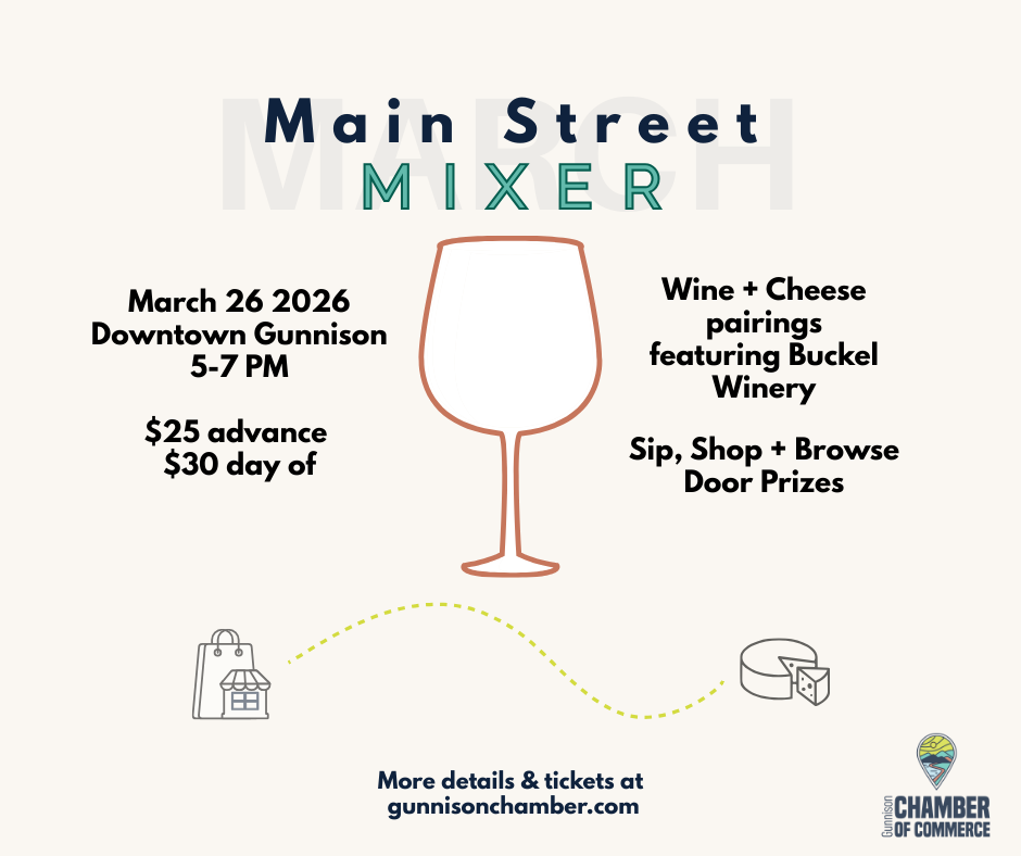 The Main Street Mixer is a downtown wine walk designed to celebrate Gunnison’s downtown businesses and invite the community to sip, shop, and browse along Main Street. On Thursday, March 26 from 5–7 pm, attendees can enjoy a relaxed, social evening exploring participating Chamber businesses and experiencing downtown Gunnison in a lively but approachable way.