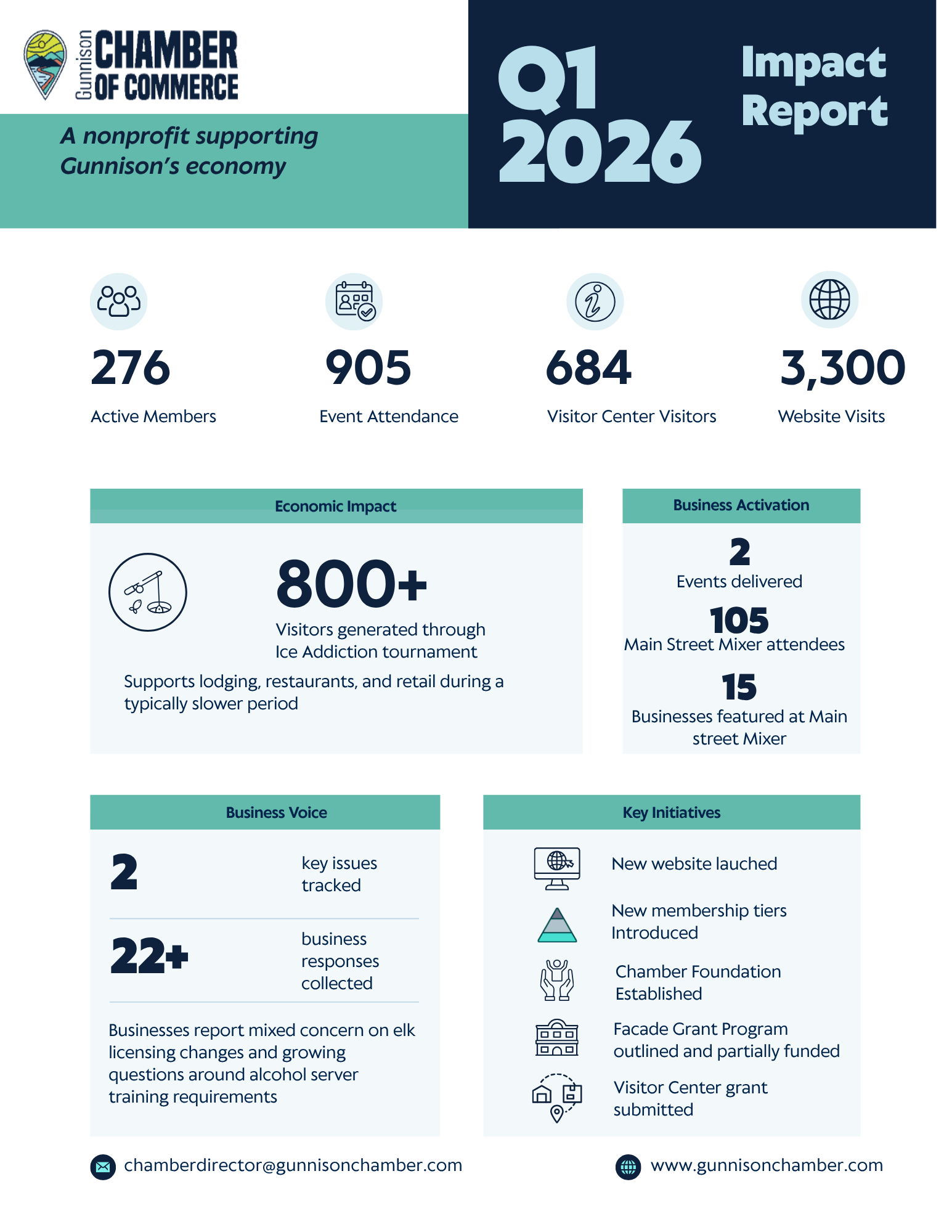 Q1 focused on strengthening the Chamber’s work and clarifying how we support and engage with Gunnison’s business community. The first quarter included strong participation across events, along with activity in visitor engagement and online traffic, and progress on several key initiatives.
